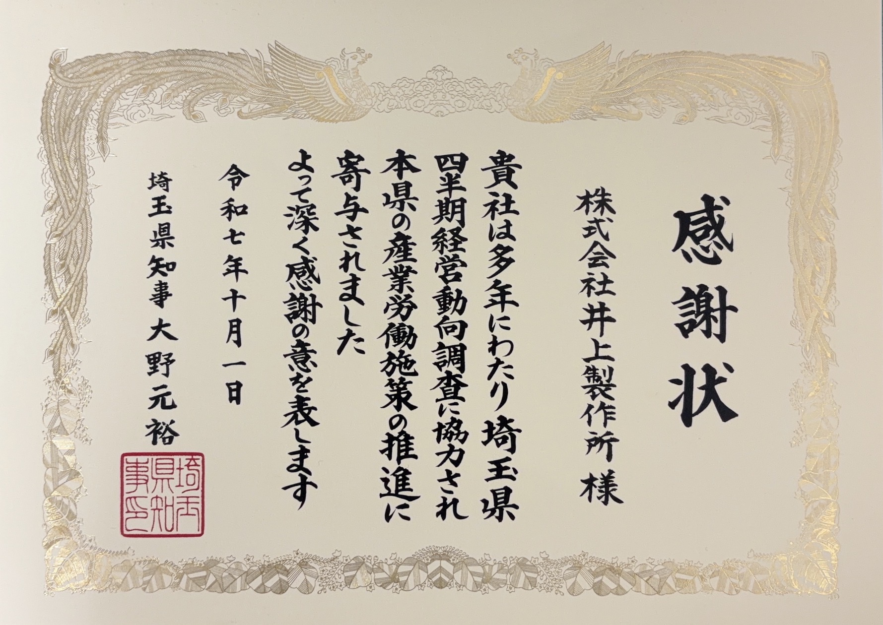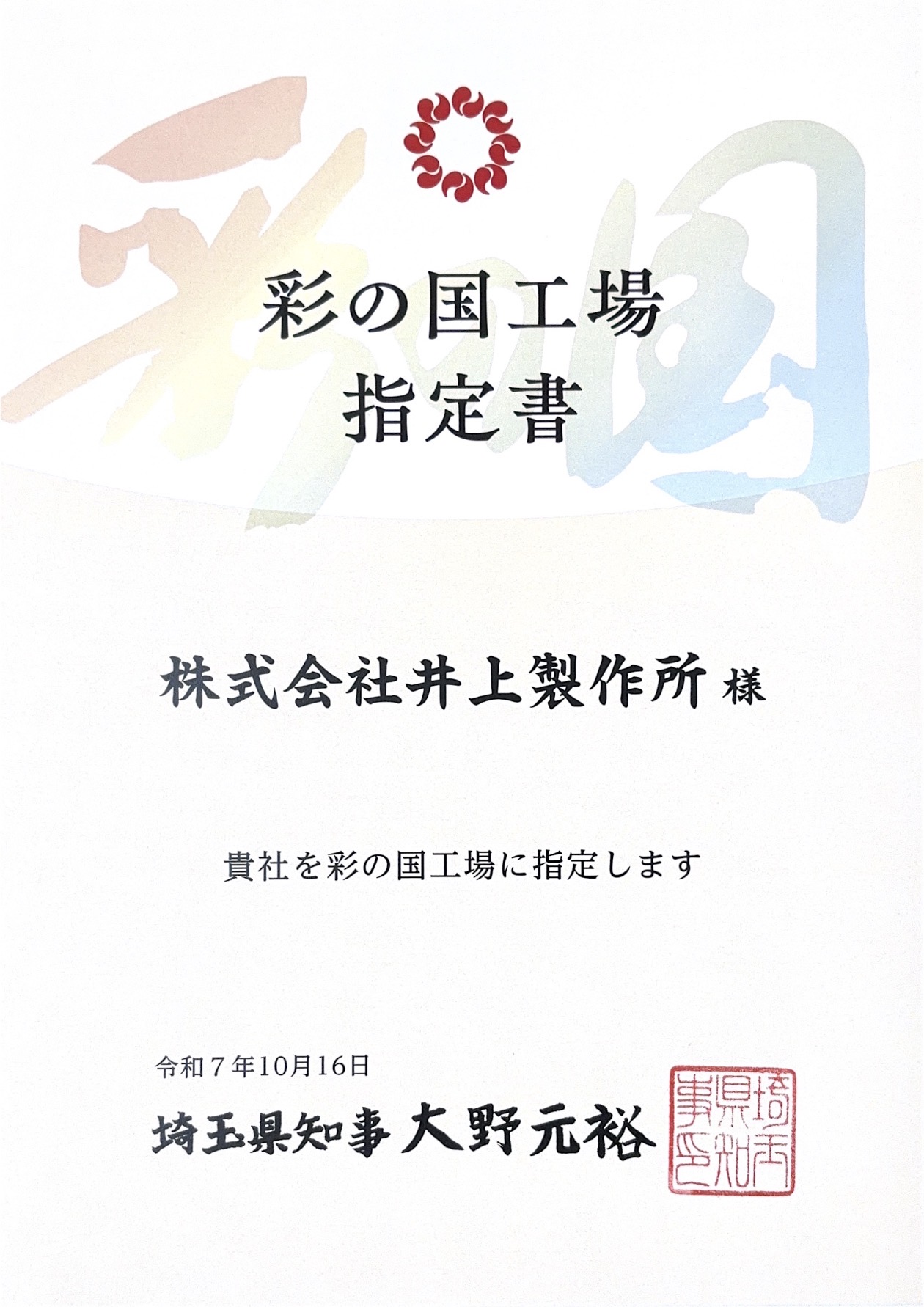 2025/10/16 彩の国工場|指定書(令和7年10月16日) 2025/10/01 埼玉県四半期経営動向調査|感謝状(令和7年10月1日) 2025/06/30 株式会社デンソー|感謝状(令和7年6月30日) 2025/01/22 彩の国ビジネスアリーナ2025(令和7年1月22日) 2024/11/01 品質月間(令和6年11月1日) 2024/06/27 株式会社デンソー|感謝状(令和6年6月27日)